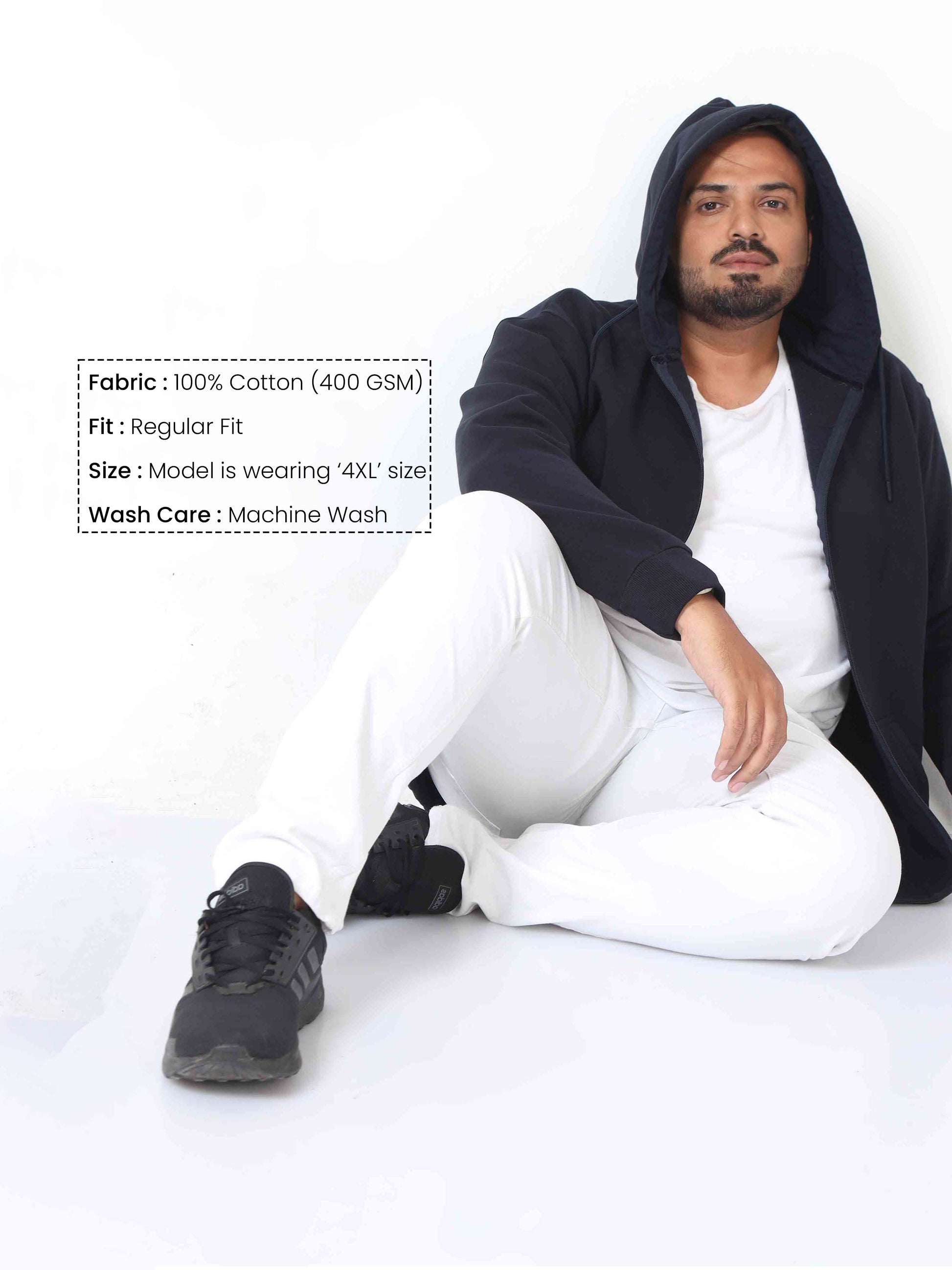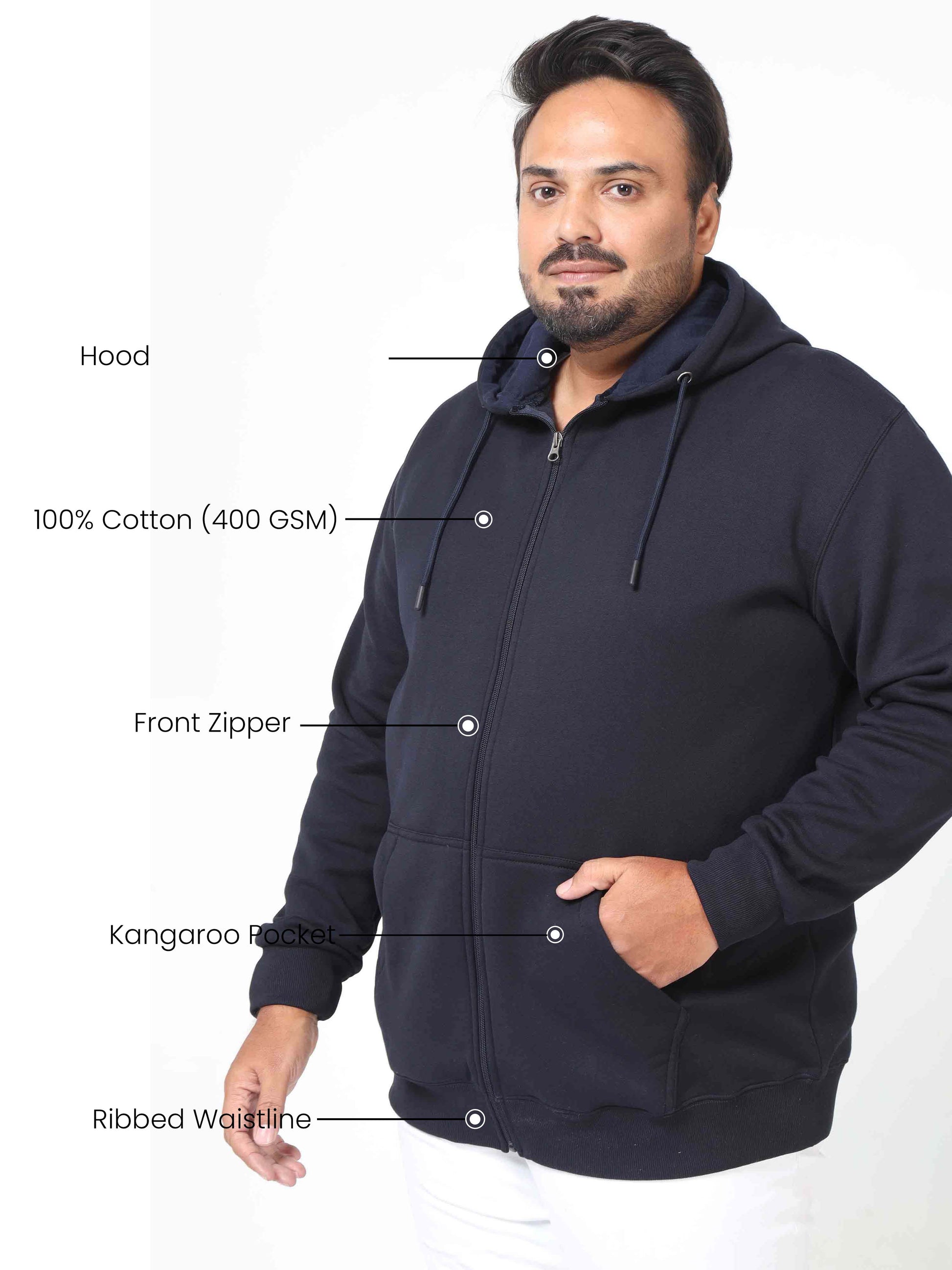 Stay cozy and adaptable with our zip-up hoodie, a versatile layer that seamlessly merges warmth and convenience. Product Specification: Full Sleeves Front Zipper Kangaroo Pocket Hoodie with drawstring Ribbed Cuff and Waistline Size: Model is wearing 5XL size Fabric: 100% Cotton (400 GSM) Wash Care: 30° Machine Wash, Do not bleach, Warm Iron, Do not Tumble Dry, Do not dry in direct sunlight.
