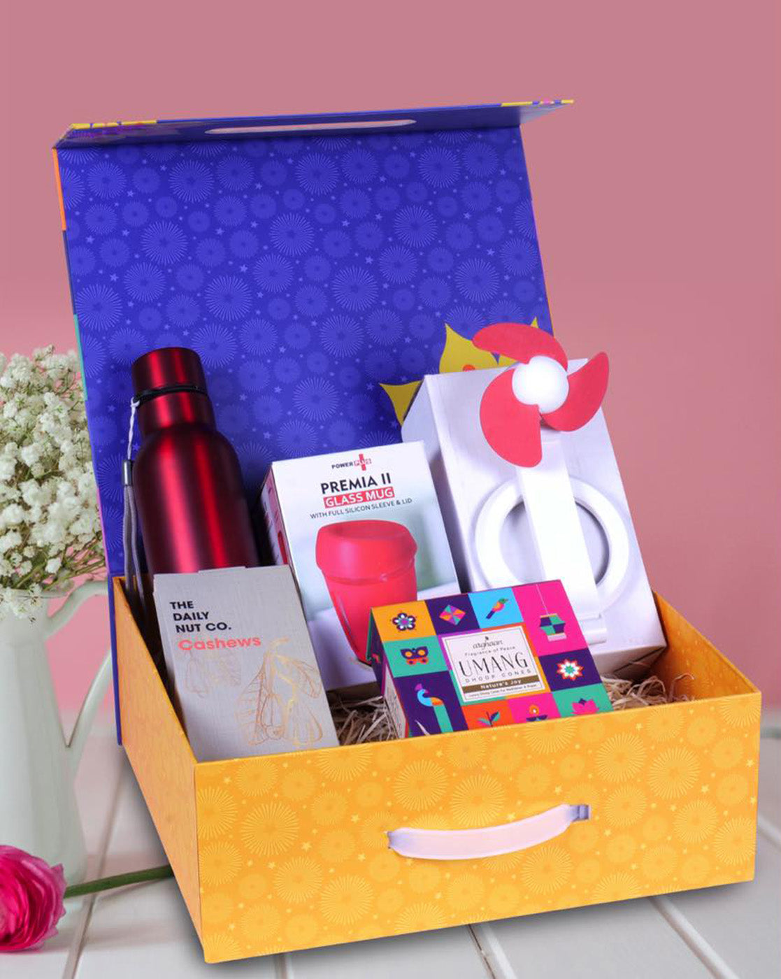 Premium 5 in 1 Celebration Gift Set featuring a glass mug, stainless steel bottle, USB fan, aromatic dhoop cones, and crunchy cashews. Perfect for festive and corporate gifting.
