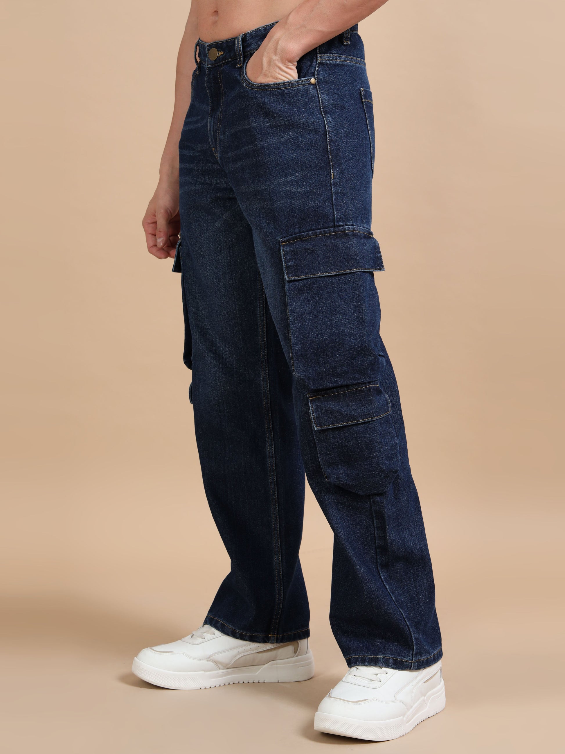 Upgrade your everyday style with these Dark Blue 8-Pocket Cargo Denim Jeans, designed for both functionality and fashion. Crafted from high-quality denim fabric, these jeans offer a comfortable fit with a rugged edge. Featuring eight spacious pockets, including cargo-style side pockets with flap closures, they provide ample storage for your essentials. The deep indigo wash and classic straight-leg silhouette make them a versatile choice for casual outings or streetwear-inspired looks. Pair them with sneakers and a tee for a laid-back vibe or dress them up with boots for an urban appeal. Fabric: Premium denim for durability and comfort Color: Blue acid wash for a vintage appeal Fit: Relaxed fit for a comfortable wear Pockets: 8-pocket design, including spacious cargo pockets for added utility Waistband: Belt loops with a secure button closure Versatile Styling: Pairs well with sneakers, tees, and jackets for a streetwear look Occasion: Ideal for casual outings, streetwear, and everyday wear