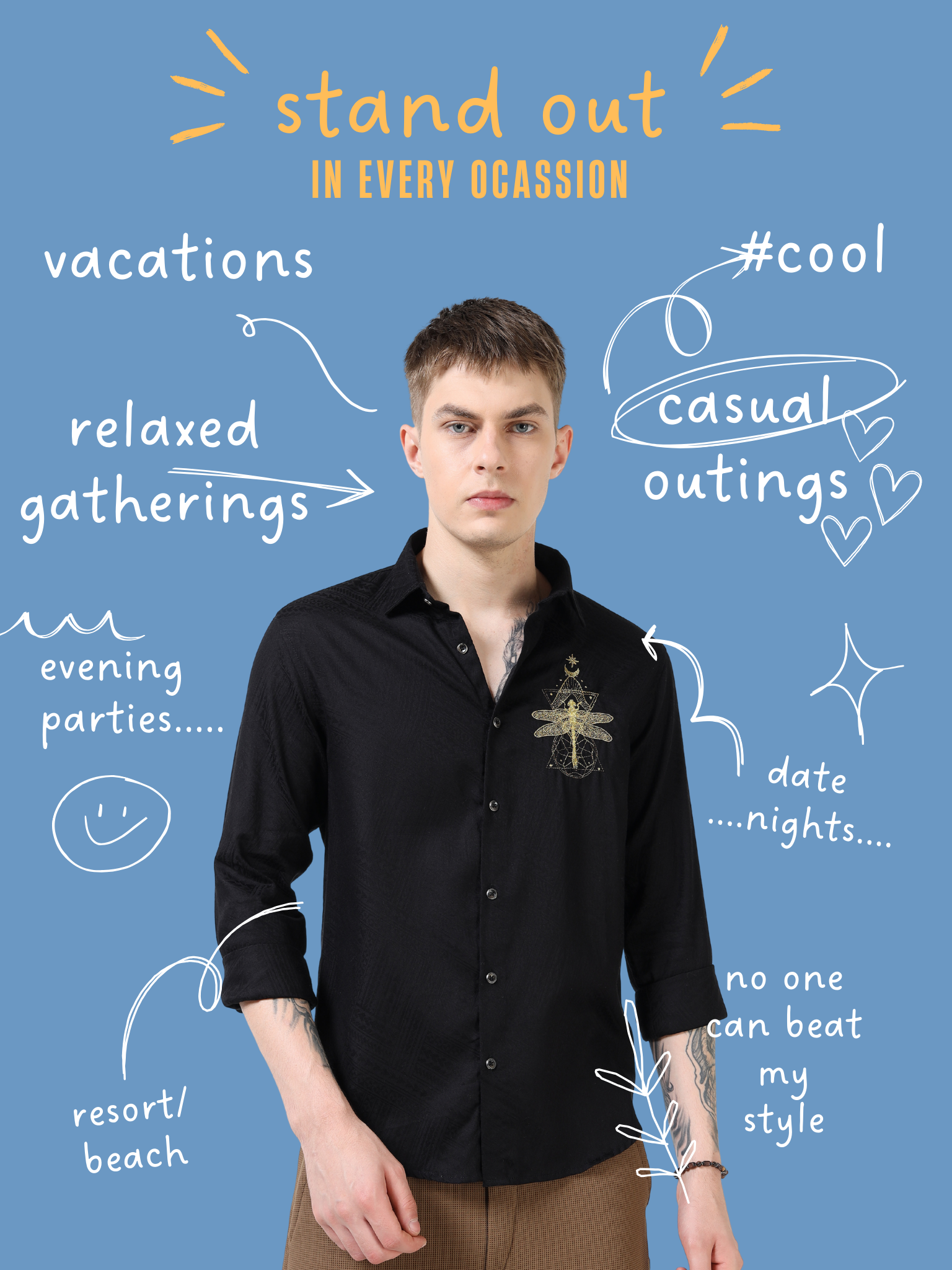 Men’s Black Textured Cotton Casual Shirt with Golden Dragonfly Embroidery