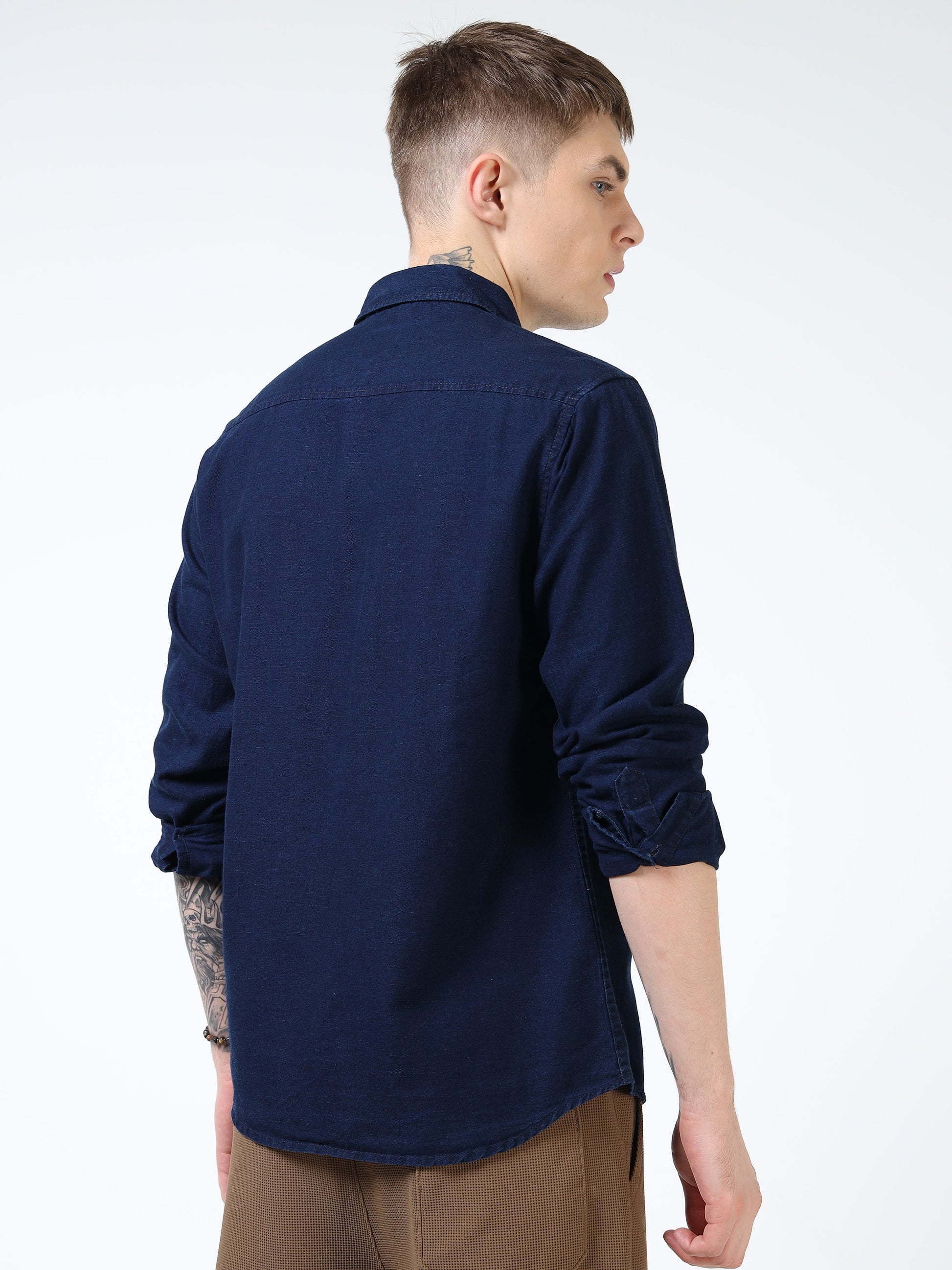 Men’s Dark Indigo Blue Denim Cotton Utility Shirt with Dual Flap Pockets
