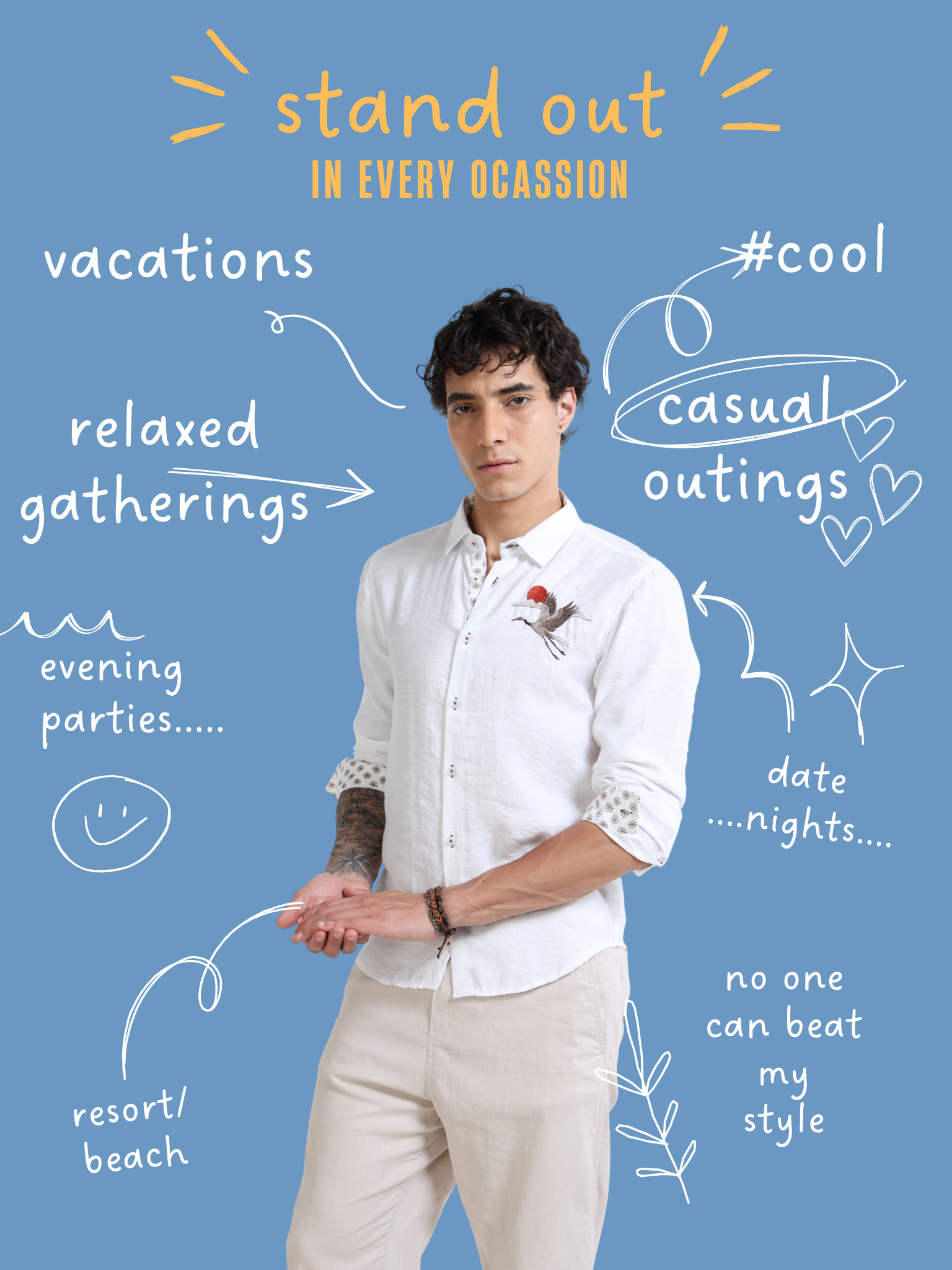 Refresh your wardrobe with this crisp white cotton shirt from the CRAFTED EMBROIDERIES collection. Featuring a striking bird embroidery on the chest with a contrasting sun detail, it adds an artistic and modern edge to your casual style. The lightweight cotton fabric ensures superior breathability and comfort, while the roll-up sleeve design enhances versatility. Finished with patterned inner cuffs and button placket, this shirt pairs effortlessly with chinos, denims, or shorts. Perfect for brunches, holidays, or evening gatherings, it seamlessly blends relaxed charm with refined sophistication. Key Features Premium-quality white cotton fabric Bird embroidery with red sun detail on chest Patterned inner cuffs and placket lining Slim tailored fit with button closure Ideal for casual outings, vacations, and smart-casual events