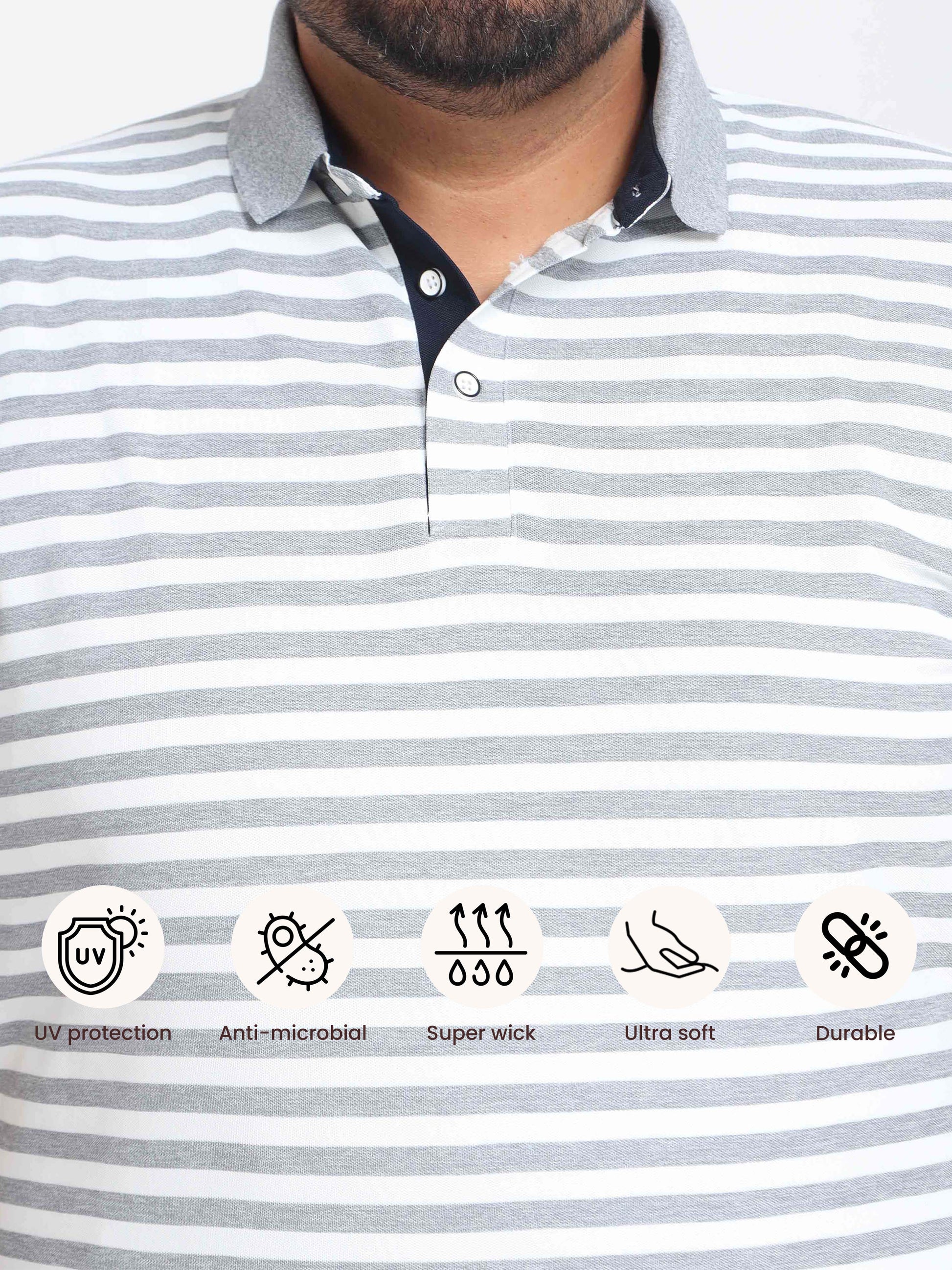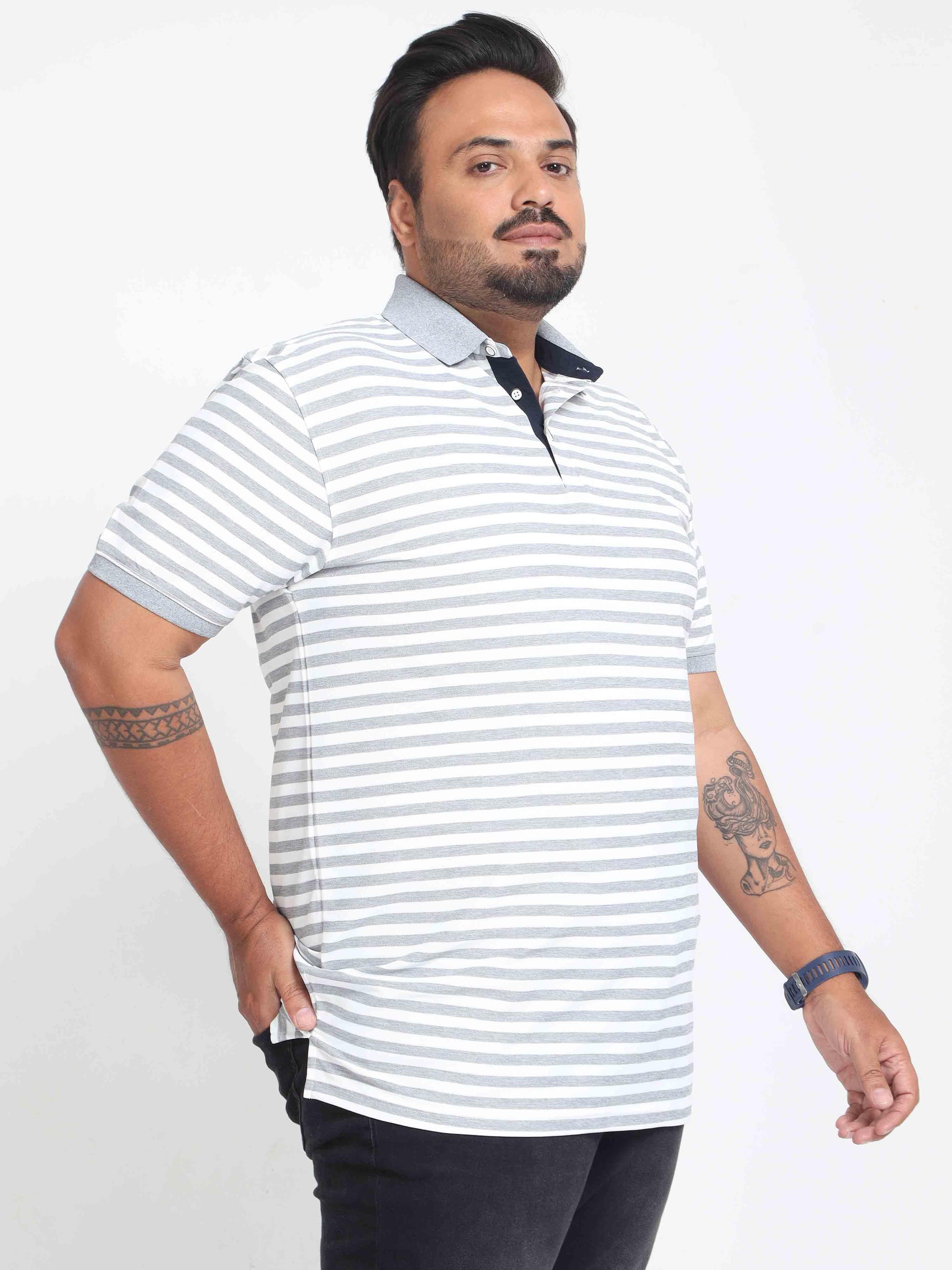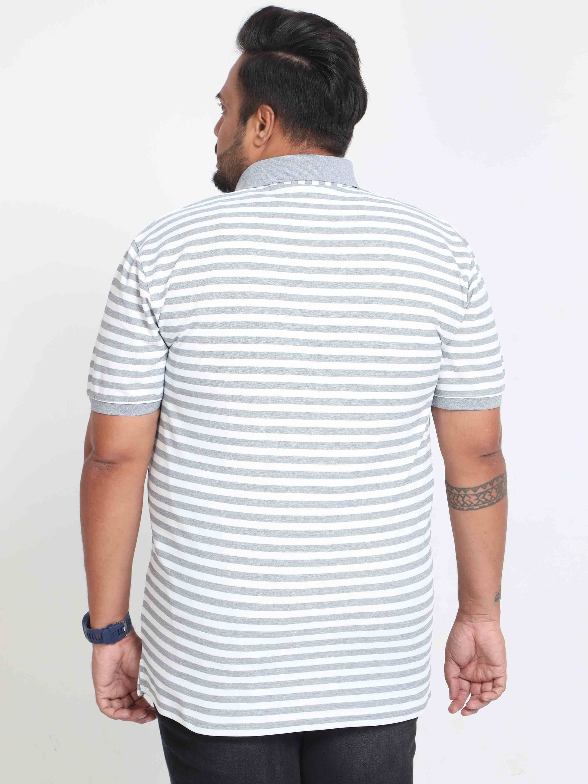 Plus Size White & Grey Stripe Men's Polo T-shirt