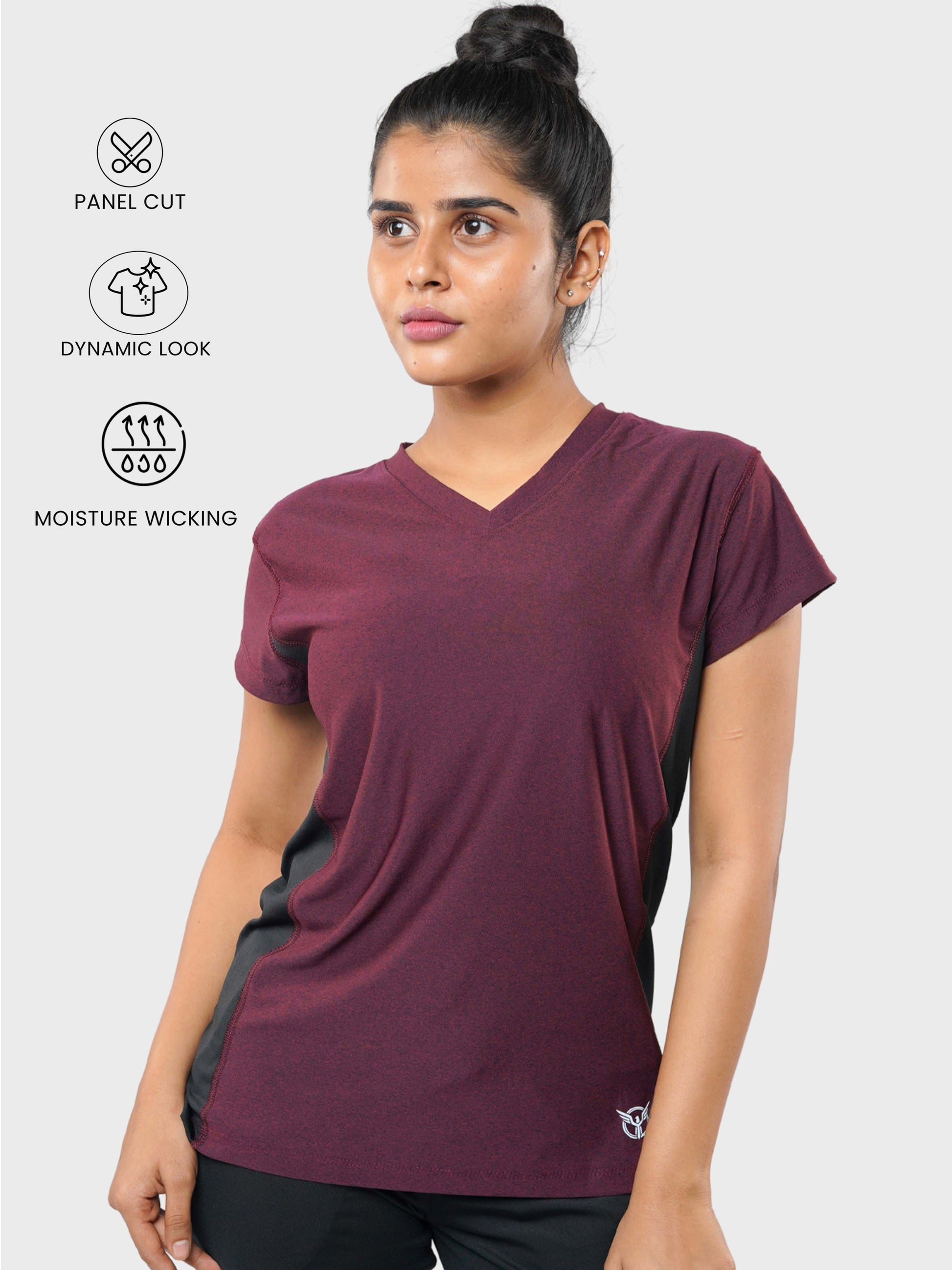 PRODUCT DETAILS Classic V-Neck Workout Tee Stylish design with side black contrast panels and a heather effect main fabric Comfortable fit with short cap sleeves for ease of movement Vibrant, brilliant colors that make you look and feel wonderful FABRIC CONTENT: 90% POLY 10% ELASTANE